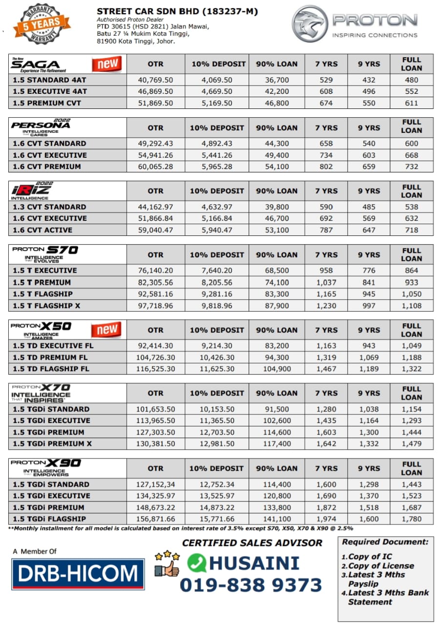 Hai! Nama saya Husaini, Sales Advisor Proton Kota Tinggi yang sah.